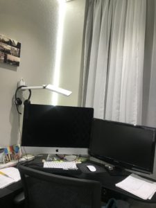 Nachdem wir nun im November 2020 unser neues Appartement bezogen hatten, stellte sich die Frage nach einer angemessenen Gestaltung unserer Arbeitsplätze. Da wir auch weiterhin bis auf Weiteres unseren Arbeitsalltag gemeinsam im Homeoffice verbringen würden, sollte der Bereich einigermaßen von unserem Wohnraum abgetrennt, aber eben auch offen für das wenige Tageslicht sein.