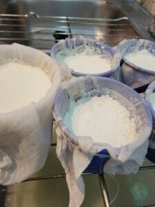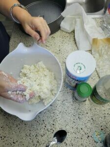 Erstmal die Milch auf 44°C erhitzen. Hmmm, das war Herausforderung Nr. 1 denn, woher wissen wir, wann 44°C erreicht sind? Unser Fleisch-Thermometer geht erst ab 49°C los. Nun denn, dann eben bis kurz davor. Dann Joghurt und das aufgelöste Lab einrühren und eine Stunde abkühlen lassen (und inzwischen Celina vom Tanz-Training abholen). Zu unserem Erstaunen „gelierte“ die Pampe wirklich und konnte mit dem Schneebesen zerkleinert werden, um dann wieder eine Weile zu ruhen. Dann die Pampe in Abtropf-Formen geben und trocknen lassen. Bei einem „Mutschli“ waren wir gleich übermütig und kippten Kräuter, Knoblauch und Salz dazu, um zu sehen was passiert. Das war dann quasi schon der „Frischkäse-Status“ (oder american: Cream Cheese), der dann erstmal über Nacht und den nächsten Tag über trocknen und ruhen musste.