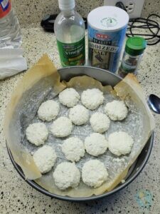 Andrea war im Herbst 2022 aus Germany zurück und freute sich, mal wieder Harzer Käse und „richtigen Käse“ gegessen zu haben. Zu etwa gleicher Zeit kam unsere erste Wild-Bestellung an und – weil wir es ja „richtig“ zubereiten wollten – brauchten wir etwas zum Einlegen und marinieren. Nun ist das ja hier alles etwas anders als in Deutschland und somit Buttermilch ein eher rarer Artikel im Kühlregal. Also brauchten wir etwas Ähnliches. Und irgendwie kamen wir beim Recherchieren auf eine Seite mit Hauskäse-Herstellung. Nun klang das ja alles gar nicht so schwer und, kreativ wie wir sind, kauften wir einen Topf Cottage Cheese (in Germany: „Hüttenkäse“) und starteten den Versuch Käse und Wild-Marinade zu machen. Also wurde die Flüssigkeit ausgepresst und darin das Wildfleisch eingelegt, die verbliebene klumpige, quarkähnliche Masse getrocknet, später mit etwas Baking-Soda, Salz und Kümmel versetzt und dann… gewartet. Zu unserem Erstaunen verwandelte sich die weiße Pampe wirklich recht schnell in eine leicht glasige, Harzer-Käse ähnliche Masse. Ok, jetzt ein paar Tage trocknen und regelmäßig mit Salzlauge abreiben und… taddaaaaa, unser erster eigener Käse war „geboren“.