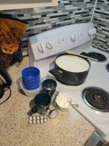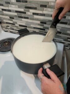 Nun wollten wir aber auch mal etwas anderes versuchen. Ob wir auch „richtigen Käse“ machen können? So mit Geschmack und hausgemacht? Mehr als schief gehen oder wie amerikanischer Käse nach nichts schmecken kann es ja nicht. Also: eine Gallone Frischmilch, Lab-Tabletten und Naturjoghurt „organisiert“ und los ging’s!