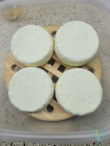 Nun hieß es warten, warten, warten. Die Käserohlinge ruhten derweil in unserem Reisekühlschrank (wobei Kühlschrank vielleicht ein etwas übertriebenes Wort ist, weil er nicht kälter als 12 °C wird) und wurden täglich mit Salzwasser abgerieben. Und ja, mit der Zeit wurden die Käslinge fühlbar fester in ihrer Konsistenz.