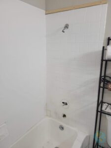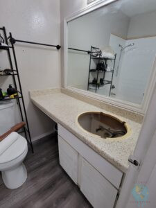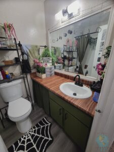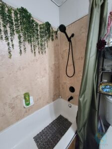 Das nächste Projekt „Pimp my Bad“ beantragte unser Töchterlein. Ja, zugegeben, die Fliesen in ihrem Bad sind reichlich abgewohnt und Madam wünschte ein neues Einrichtungs-Design. Da man ja nun hier nicht wild drauf los renovieren (ja, nicht mal die Wände streichen) darf, mussten neue Ideen her. So fuhren wir zum nächsten Home Depot (Baumarkt), bewaffneten uns mit Plastikpaneelen, doppelseitigem Klebeband, neuen Armaturen, Farben und Klebefolie, und los gings! Madams Farbkonzept gab Holz, dunkles Olivgrün und schwarz vor. Also überklebten wir an der Badewanne die „schicken“ Fliesen mit besagten Paneelen und selbige mit Klebefolie in beiger Beton-Optik, tauschten das hässliche alte Waschbecken gegen ein Neues aus samt optischer Überarbeitung der Ablagefläche, bauten neue moderne schwarze Armaturen ein (bzw. lackierten die Bestandsarmaturen mit Sprühfarbe) und rundeten das mit einem grünen Anstrich des Schrankes und einem passenden Duschvorhang ab.