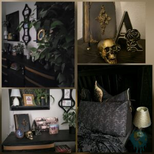Gesagt, getan! Leider ist der Raum eh schon ziemlich dunkel, aber da macht es auch nichts aus die Raum-Farben auf schwarz und gold zu ändern. Da auch hier nicht mit Malerfarbe gearbeitet werden kann muss halt die Wand mit Stoff verkleidet werden.